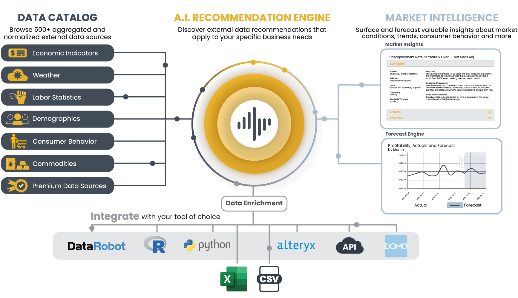 We provide robust APIs and SDKs that allow for easy integration in R and Python, as well as pre-built connectors for popular data science platforms like Data Robot, Domo, and Alteryx. Whether you’re a seasoned data science professional or an Excel power user, we have the integration solution that’s right for you.