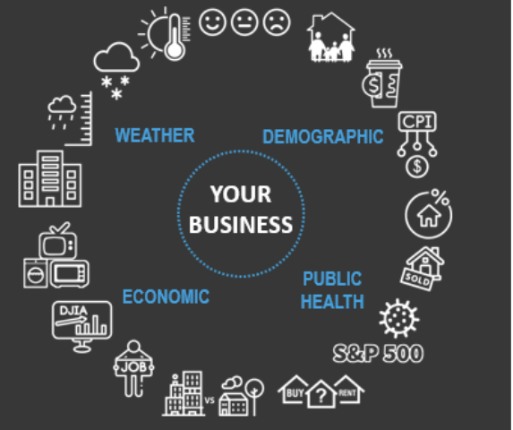 As with anything in life, context matters. Every business has a wealth of internal data on their customers, promotions, supply chain, etc. But there are also a plethora of external factors surrounding your business that have a very real effect on outcomes. If you don’t know how your business is responding to the external factors surrounding it, you aren’t looking at the full picture and are at risk of making uninformed business decisions. Whether it is economic factors like unemployment rate or median household income, or higher/lower than average weather patterns, it is imperative to know what these factors are and understand how your business reacts to them. This will inform your sales forecasts, evaluate your marketing efforts in context of surrounding forces, and identify possible leading indicators of business shifts that you can proactively plan for.