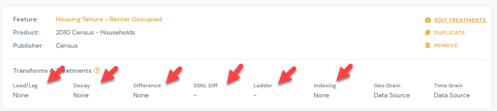 TIP: If you want to see how a features data looks with different Data Science treatments applied, you can duplicate the feature and apply different data science treatments to each one. You will then see them as two different columns in the output, in order to decide which one you want to use.