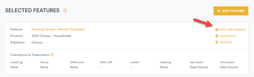 1) From Manage Signal page, click on Edit Treatments link for the feature you would like to apply a Data Science treatment to: