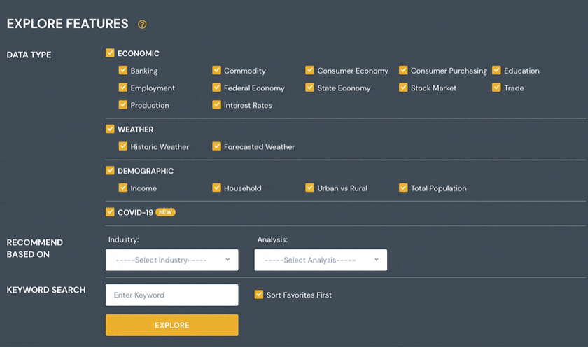 Choose the control data (features) you want to use. The system will recommend data sets to consider based on your model type and industry.