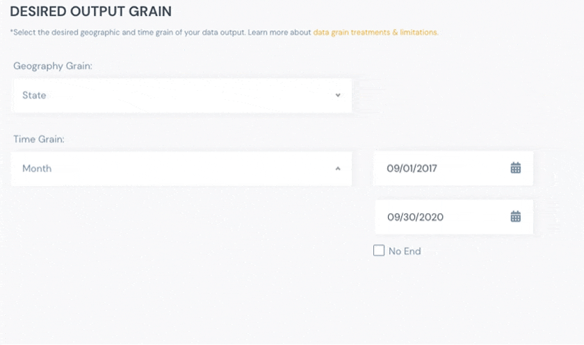 Select the time and geographic granularity you require. As an example, weekly data by U.S. State. Then select your desired data science treatments, including leads, lags, differencing and decays, from the 15 plus transformations built into the software.