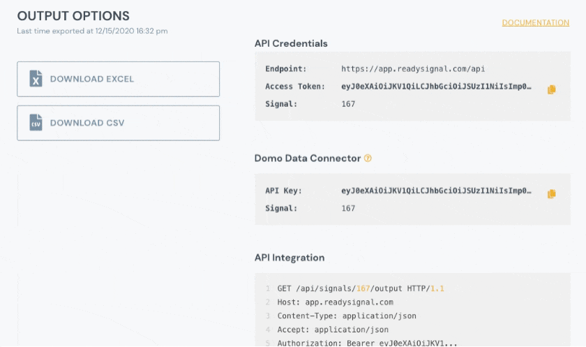 Lastly, pick how you would like to receive your data. Connect directly to Ready Signal via R, Python, Domo or the API client of your choice or download your signal to an Excel or CSV file.