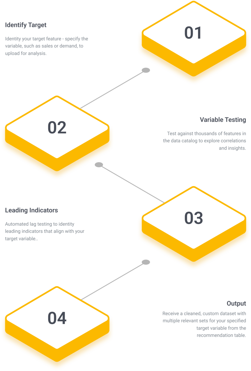 Unlock the full potential of your business or product with Ready Signal’s A.I. powered Recommendation Engine. Effortlessly discover the most relevant external factors, market trends, and consumer behavior tailored to your unique needs. Accelerate your data-driven decision-making process and achieve unparalleled accuracy in a fraction of the time.
